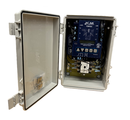 The 3VMS combines the benefits of the ICM450A programmable 3-phase line voltage monitor and a ICM530 type 1 and type 2 three-phase Surge Protective Device into one easy to install solution. The 3VMS protects against both power surges and over/under voltage issues that can cause damage to circuit boards and motors in residential and commercial three-phase 208/240 VAC HVAC/R equipment.