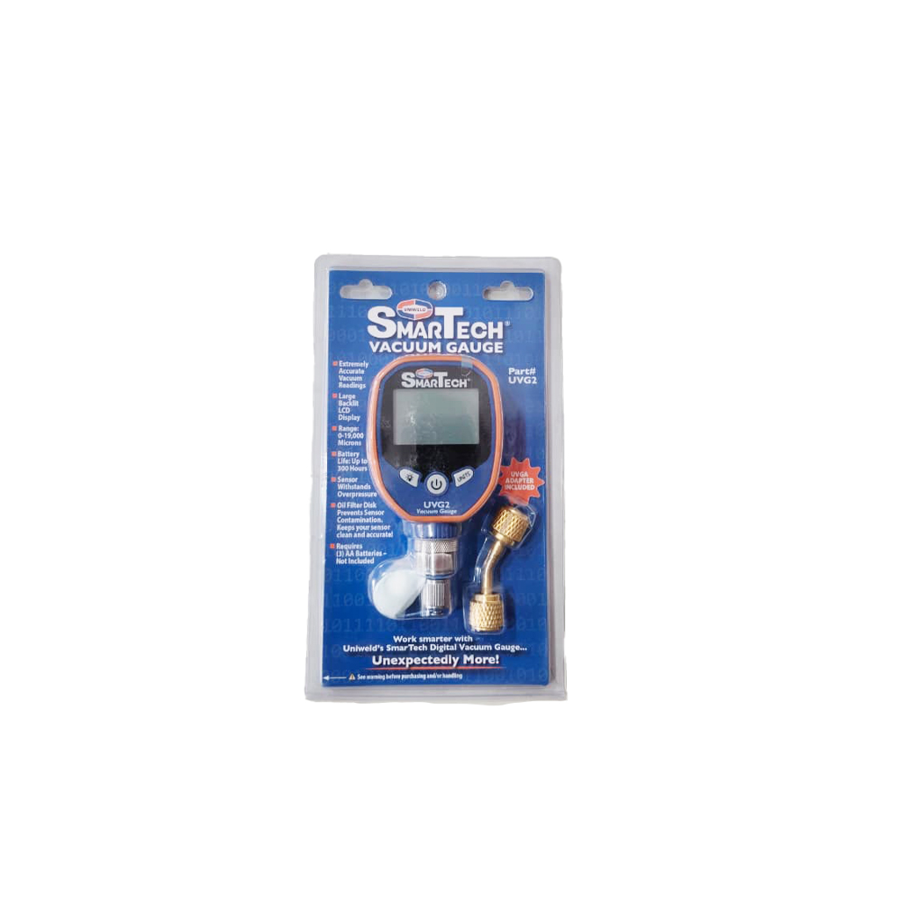 Uniweld UVG2 Digital Vacuum Gauge provides unsurpassed vacuum accuracy and quickly measures vacuum in Microns, Pascals, Millibar, and mmHg with a resolution down to 1 micron. Oil Filter Disk Prevents Sensor Contamination. Keeps your sensor clean and accurate! Temperature Compensated Self-Calibration. Large, High-Visibility Backlit LCD Display. Requires (3) AA Batteries – Not Included