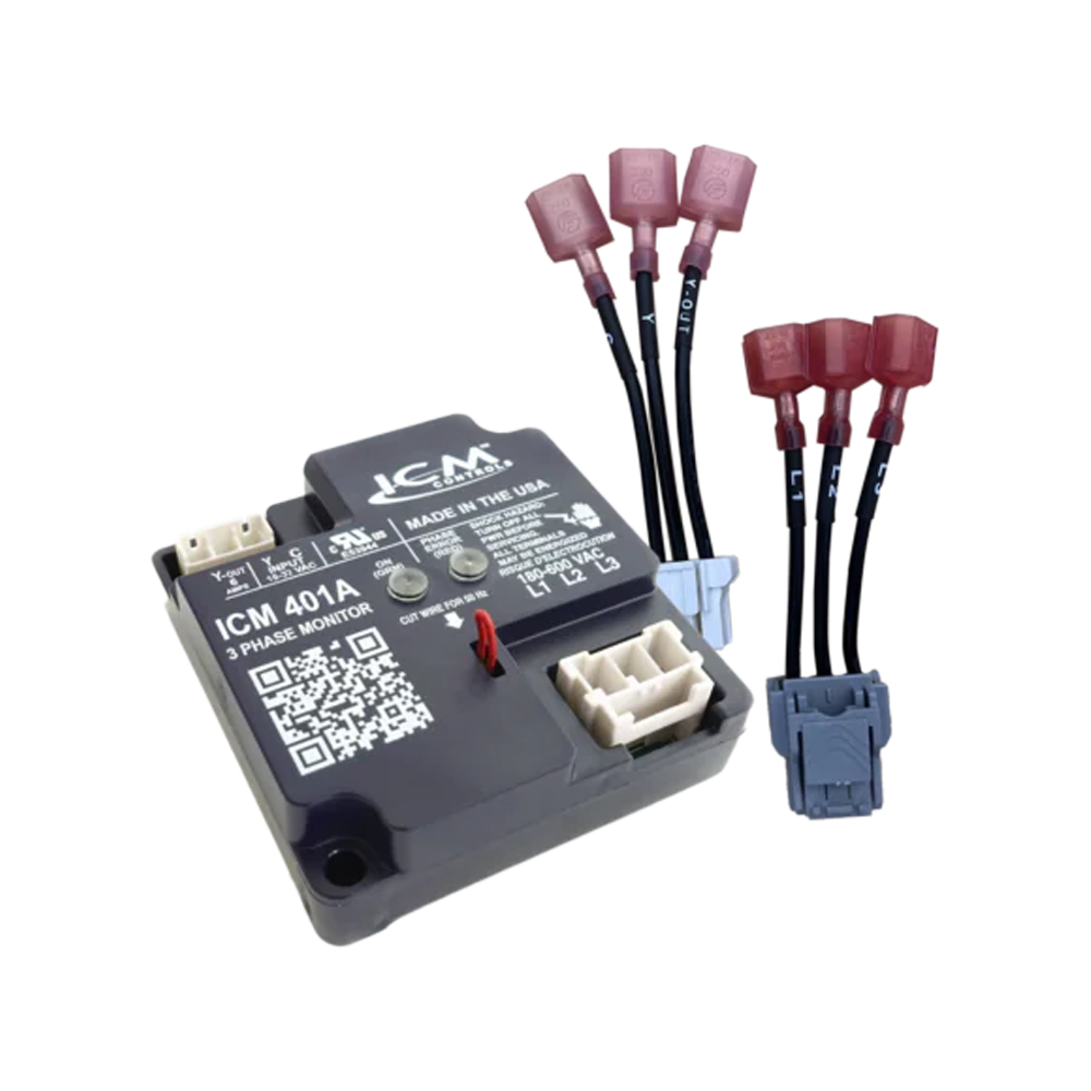 Upon wiring three phase voltage (180-600 VAC) to the ICM401A and connecting 24 VAC single-phase voltage to the Y & C terminals, the control will continuously monitor the three-phase line for phase loss and phase reversal. If all voltage conditions are within the specified range, a green light will illuminate on the ICM401A, and the Y-OUT terminal will be energized with 24 VAC. Upon a phase loss or a phase reversal, a red fault light will illuminate on the ICM401A indicating a fault is presently occurring and the Y-OUT terminal will be de-energized. Once the fault is no longer present and providing the 24 VAC control voltage is still applied at Y & C, the ICM401A will automatically re-energize the Y-OUT terminal.