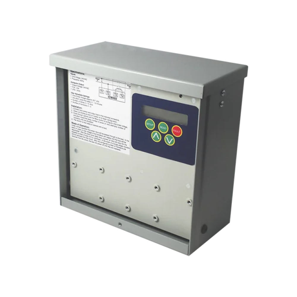 The ICM493 is an advanced, single-phase line voltage monitor with a bank of surge arresters for added protection against brownouts, lightning strikes, power outages & recoveries, startup of larger equipment, power grid faults, short circuits and more. Includes a built-in 40A contactor. Housed in a NEMA Rated 3R enclosure for outdoor installations. UL Listed. Installs easily between the service disconnect and the condensing unit. Ideal for Mini-Splits or other valuable, single-phase equipment.