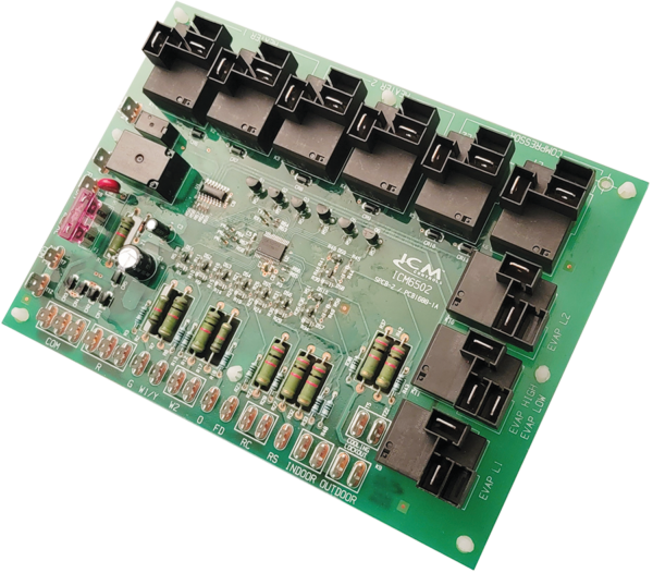 The ICM6502 is a package unit heat pump control board designed to provide control of the compressor, reversing valve, auxiliary heat elements, the condenser and evaporator fans. The ICM6502 also accepts inputs from a thermostat, indoor coil temperature, outdoor coil temperature, outdoor ambient temperature, indoor room temperature and a shutdown switch (front desk). The ICM6502 provides compressor protection from short cycling with an anti-short cycle timer and low ambient lockout. A built-in defrost cycle will protect the outdoor coil from freezing up when in heating mode.