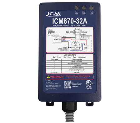 Effectively reducing power draw to the A/C, the ICM870 utilizes a built-in self learning algorithm to deliver the optimal in-rush current per application. The ICM870 will monitor system health including voltage, current, compressor startup and integrity. Upon a fault condition, it will halt operation and initiate a 3 minute anti-short cycle routine while providing diagnostic fault information by means of an LED indicator.
