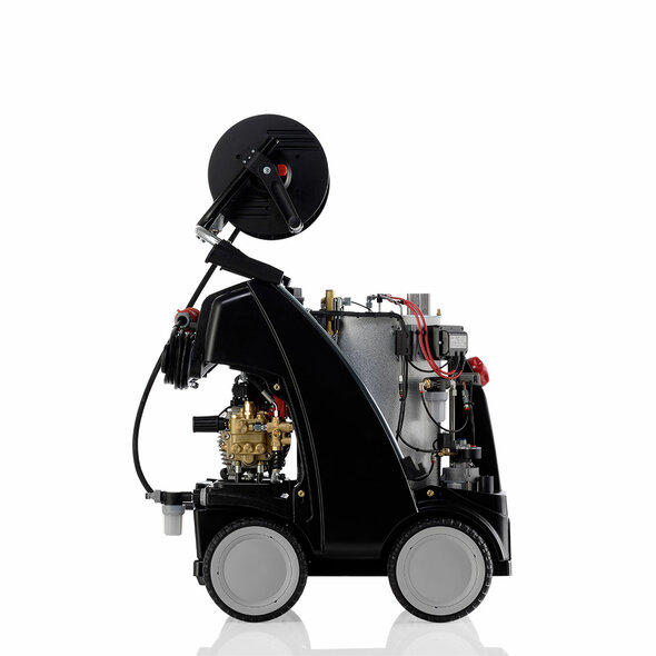 The compact entry-level model of the Kränzle hot water high-pressure cleaners with all important basic functions. These include the powerful high-pressure pump with up to 150 bar working pressure, the four-wheeled chassis, various safety devices for safe operation, the extraction of cleaning agents and the integrated hose reel (optional).